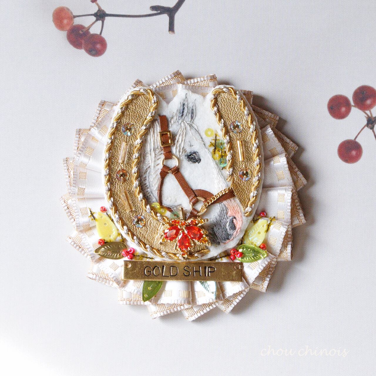 オクタゴンカットジュエリーのような形をしたやや大振りのブローチです。 中央には幸運のモチーフとされる馬蹄とお馬さんの横顔。 ターフグリーンの生地を土台に、ヴィンテージのストーンやビーズ、スパンコール、メタルスレッドと共に刺繍し豪勢に仕上げました。 また、裏面や側面にはゴールドに染色された牛革を採用し、ブローチの輪郭はヴィンテージの竹ビーズと本金メッキのシードビーズでかがってています。 お召し物の他、布製のバッグや布小物などに添えたり、平織りの帯紐を通して帯留めとしても。是非たくさんのアレンジとおしゃれをお楽しみくださいね。 《本作品ではヴィンテージパーツを使用しています》 小傷など経年による劣化が見受けられるものもございますが、それもまたヴィンテージパーツならではの風合いとしてお楽しみくださいませ。 《対応パーツ》馬蹄モチーフを囲むクリスタルストーン、ライトグリーンのクリスタルストーン、馬蹄モチーフの下に縫い付けた花形のモチーフ、全てのパールカバービーズ、全ての竹ビーズ、 【サイズ】 ・H 50 x W 36 x D18 mm ※手作り品の為、多少の誤差が生じます。何卒ご容赦くださいませ。 【配送について】 宅急便コンパクトでお届け致します。 15,600円(税込)以上の作品となります為「送料無料」です。 日時指定可、追跡あり、補償30万円まで、玄関先での受け渡しで配送完了です。 日時指定をご希望の方は、ご注文手続きの際にご指定をお願い致します。お時間指定のみでもOKです。ご指定の無い場合は準備が整い次第「日時指定なし」にて出荷致します。 宅配BOXへの配達をご希望の方は、ご購入手続きの際、備考欄にその旨をお書き添えください。 《補足》既に決済を完了した作品との同梱発送をご希望の場合は、一度ご相談ください。可能な場合にのみ承ります。(既に発送準備が完了していたり、規定サイズに収まらない等、同梱が困難な場合は個別発送とさせて頂きます) 【注意事項】 ・各パーツの固定の際は最後に針と糸でしっかり縫い合わせておりますが、強い衝撃を受けると変形したり、使用しているパーツやリボンが傷んだりする可能性がございます。優しくお取り扱いをお願い致します。 ・ブローチピンの先は尖っていますので、怪我をされないよう十分ご注意ください。 ・ご入金後のキャンセルはお受け出来ませんのでご注意ください。 ・掲載作品の色味は出来る限り実物の色味に近づけておりますが、ご利用のパソコン、モニター環境によって、画像の色味が異なって見える場合がございます。予めご了承下さいませ。 2026.01.23