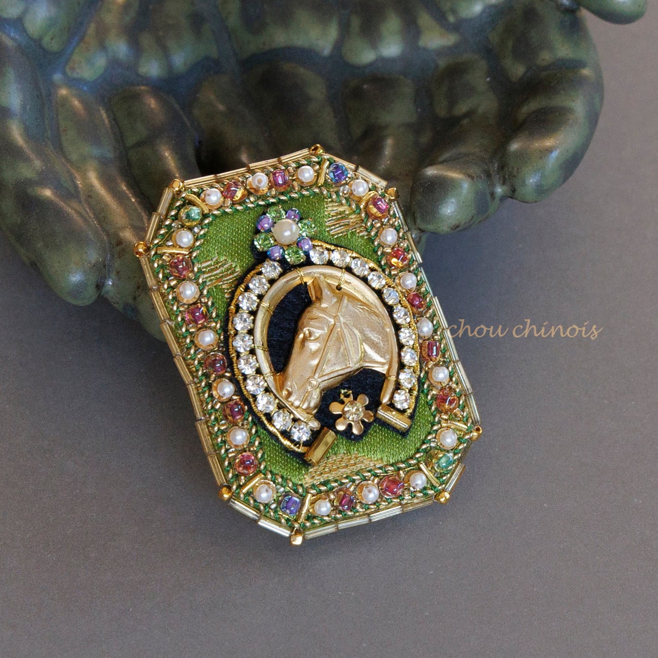 オクタゴンカットジュエリーのような形をしたやや大振りのブローチです。 中央には幸運のモチーフとされる馬蹄とお馬さんの横顔。 ターフグリーンの生地を土台に、ヴィンテージのストーンやビーズ、スパンコール、メタルスレッドと共に刺繍し豪勢に仕上げました。 また、裏面や側面にはゴールドに染色された牛革を採用し、ブローチの輪郭はヴィンテージの竹ビーズと本金メッキのシードビーズでかがってています。 お召し物の他、布製のバッグや布小物などに添えたり、平織りの帯紐を通して帯留めとしても。是非たくさんのアレンジとおしゃれをお楽しみくださいね。 《本作品ではヴィンテージパーツを使用しています》 小傷など経年による劣化が見受けられるものもございますが、それもまたヴィンテージパーツならではの風合いとしてお楽しみくださいませ。 《対応パーツ》馬蹄モチーフを囲むクリスタルストーン、ライトグリーンのクリスタルストーン、馬蹄モチーフの下に縫い付けた花形のモチーフ、全てのパールカバービーズ、全ての竹ビーズ、 【サイズ】 ・H 50 x W 36 x D18 mm ※手作り品の為、多少の誤差が生じます。何卒ご容赦くださいませ。 【配送について】 宅急便コンパクトでお届け致します。 15,600円(税込)以上の作品となります為「送料無料」です。 日時指定可、追跡あり、補償30万円まで、玄関先での受け渡しで配送完了です。 日時指定をご希望の方は、ご注文手続きの際にご指定をお願い致します。お時間指定のみでもOKです。ご指定の無い場合は準備が整い次第「日時指定なし」にて出荷致します。 宅配BOXへの配達をご希望の方は、ご購入手続きの際、備考欄にその旨をお書き添えください。 《補足》既に決済を完了した作品との同梱発送をご希望の場合は、一度ご相談ください。可能な場合にのみ承ります。(既に発送準備が完了していたり、規定サイズに収まらない等、同梱が困難な場合は個別発送とさせて頂きます) 【注意事項】 ・各パーツの固定の際は最後に針と糸でしっかり縫い合わせておりますが、強い衝撃を受けると変形したり、使用しているパーツやリボンが傷んだりする可能性がございます。優しくお取り扱いをお願い致します。 ・ブローチピンの先は尖っていますので、怪我をされないよう十分ご注意ください。 ・ご入金後のキャンセルはお受け出来ませんのでご注意ください。 ・掲載作品の色味は出来る限り実物の色味に近づけておりますが、ご利用のパソコン、モニター環境によって、画像の色味が異なって見える場合がございます。予めご了承下さいませ。 2026.01.23