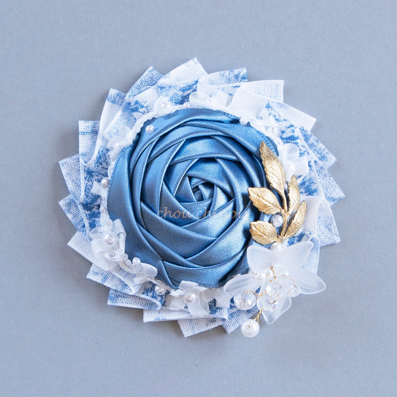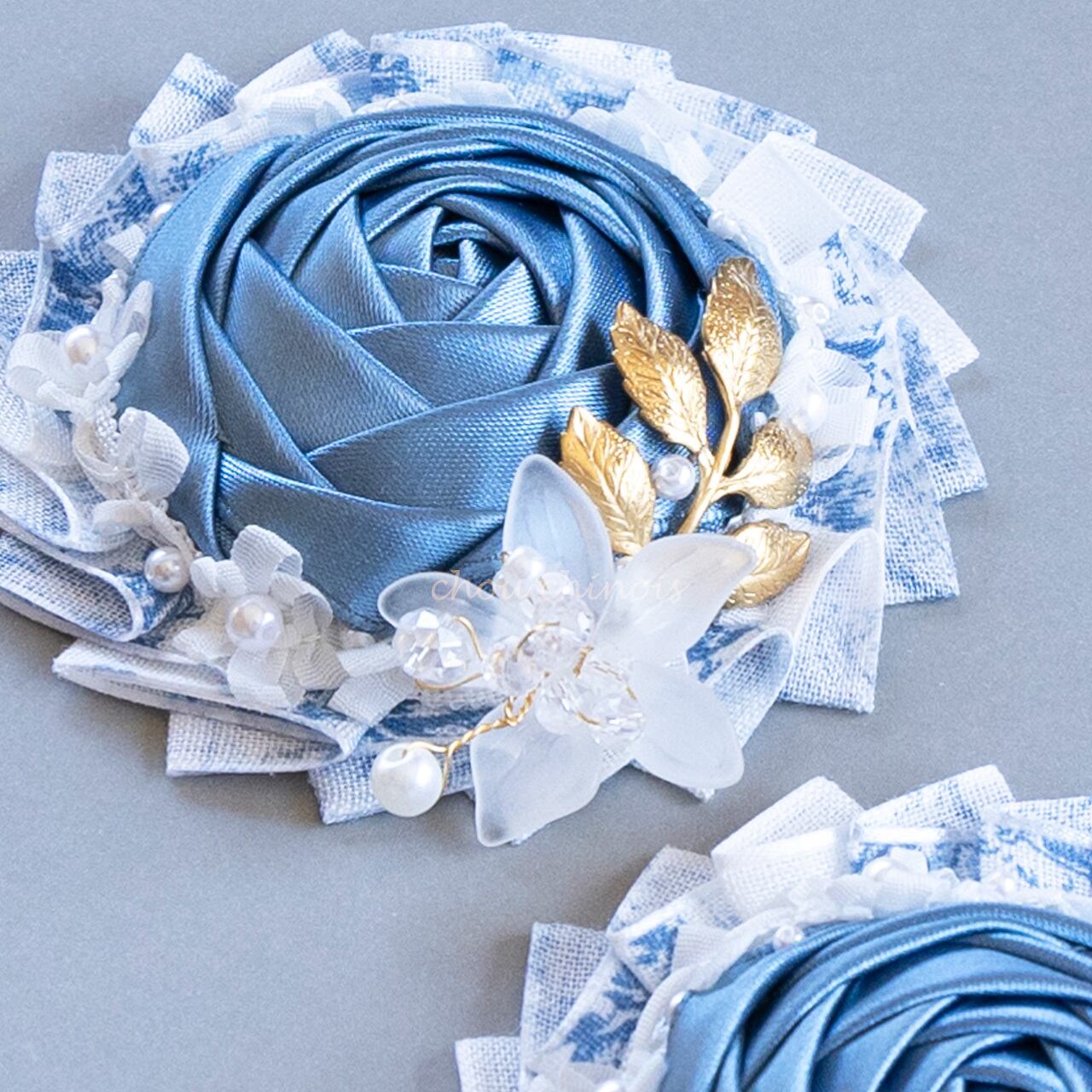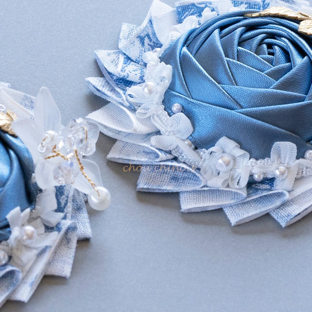 プリーツはコットンの「トワル・ド・ジュイ」柄、ドロップローズはくすみブルーのサテンリボンで制作しています。サテンリボンは通常使用しているシルクリボンと比較して肉厚な為、ボリューミィに仕上がりました。