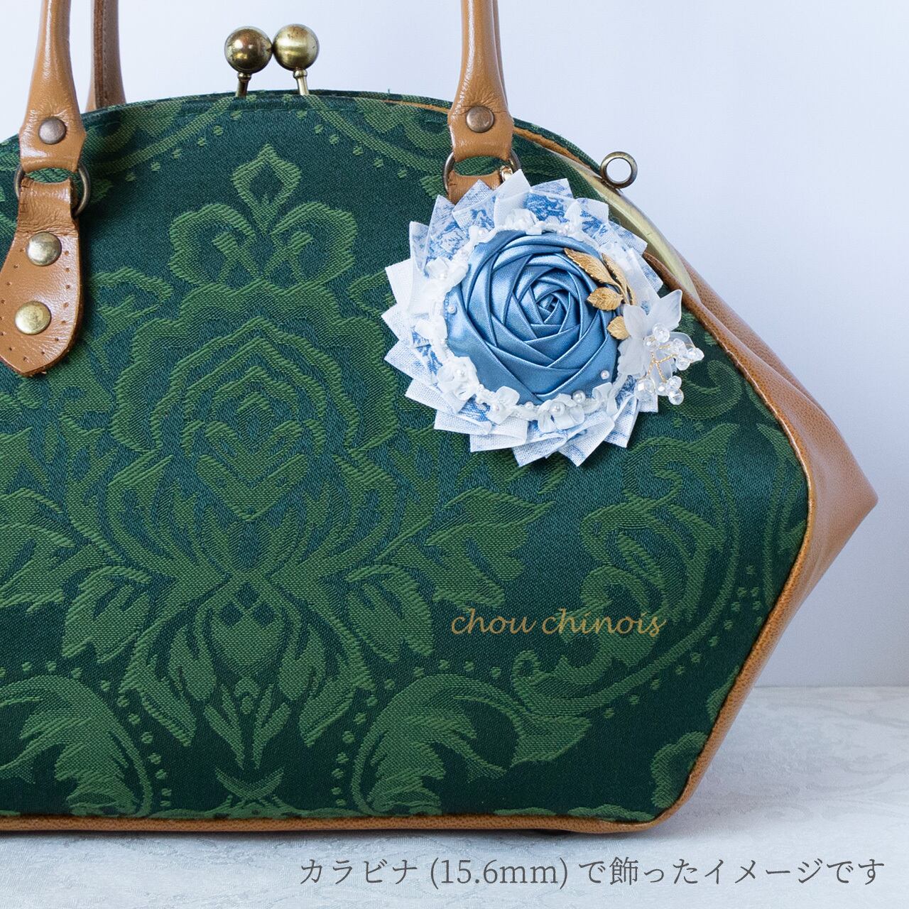 ・中央の薔薇に見立てたパーツは、シルクバイアスリボンで制作しています。シルクバイアスリボンは、あえてリボンの端の処理がされておらずほつれやすくなっています。時が経つにつれ少しずつ変わりゆく姿をお楽しみください。