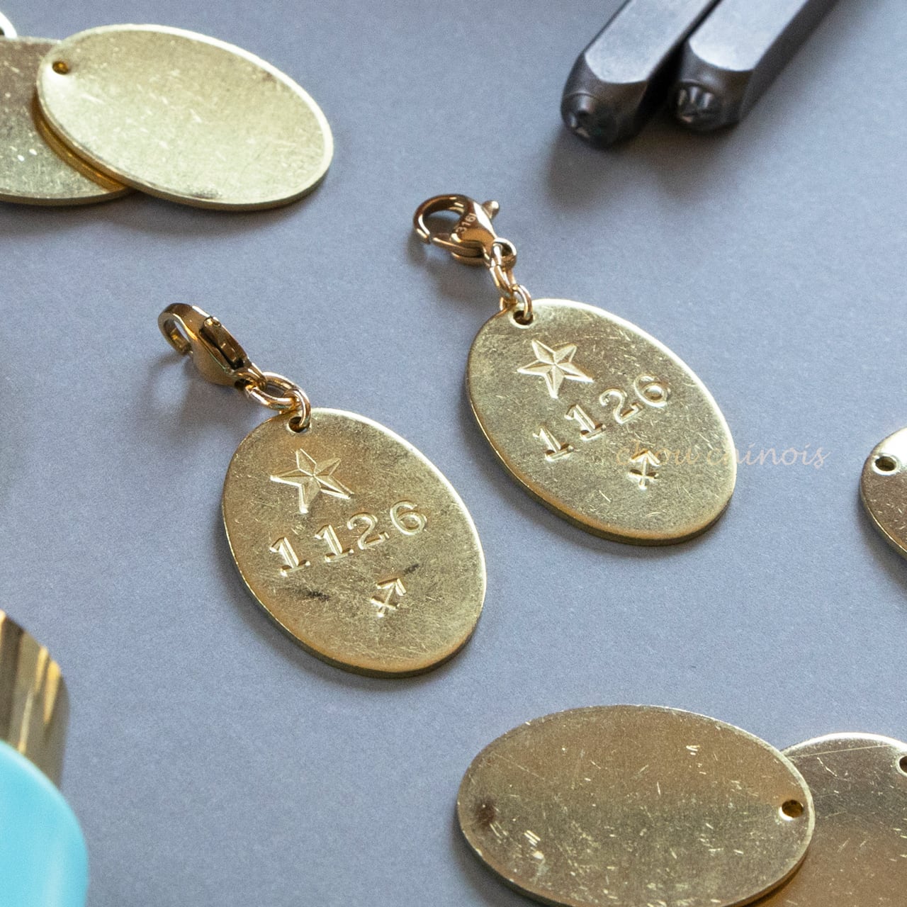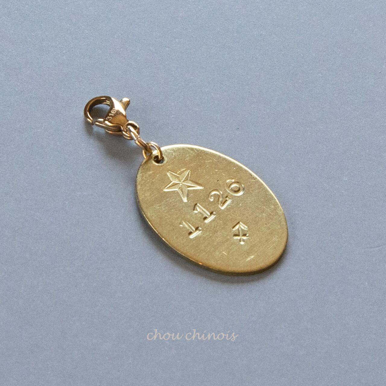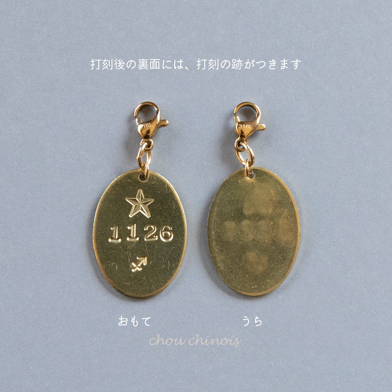 楕円の真鍮プレートに、ハンドプレスで星、4桁以内の数字、星座シンボルを打刻し、カニカンつきチャームに仕立ててお届け致します。