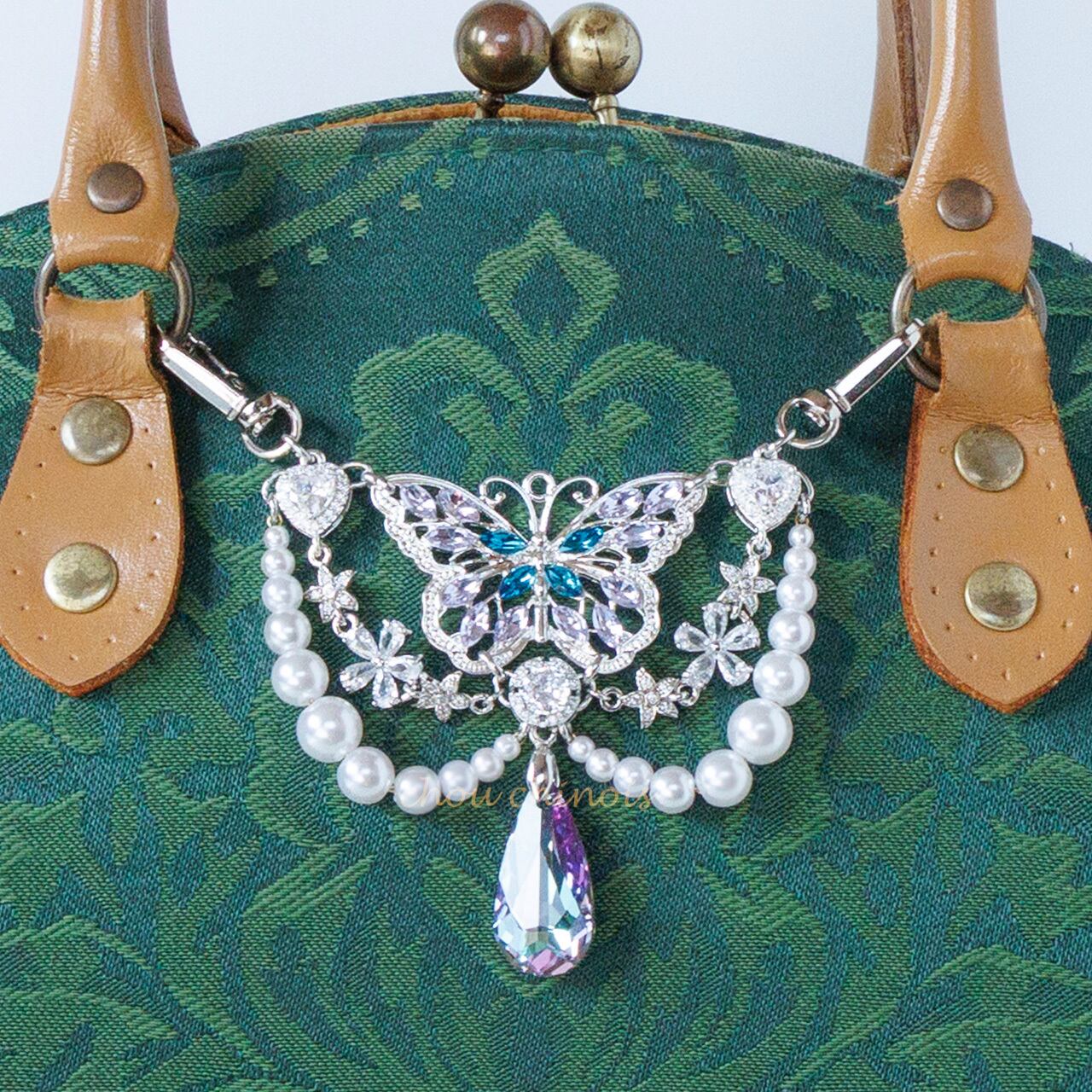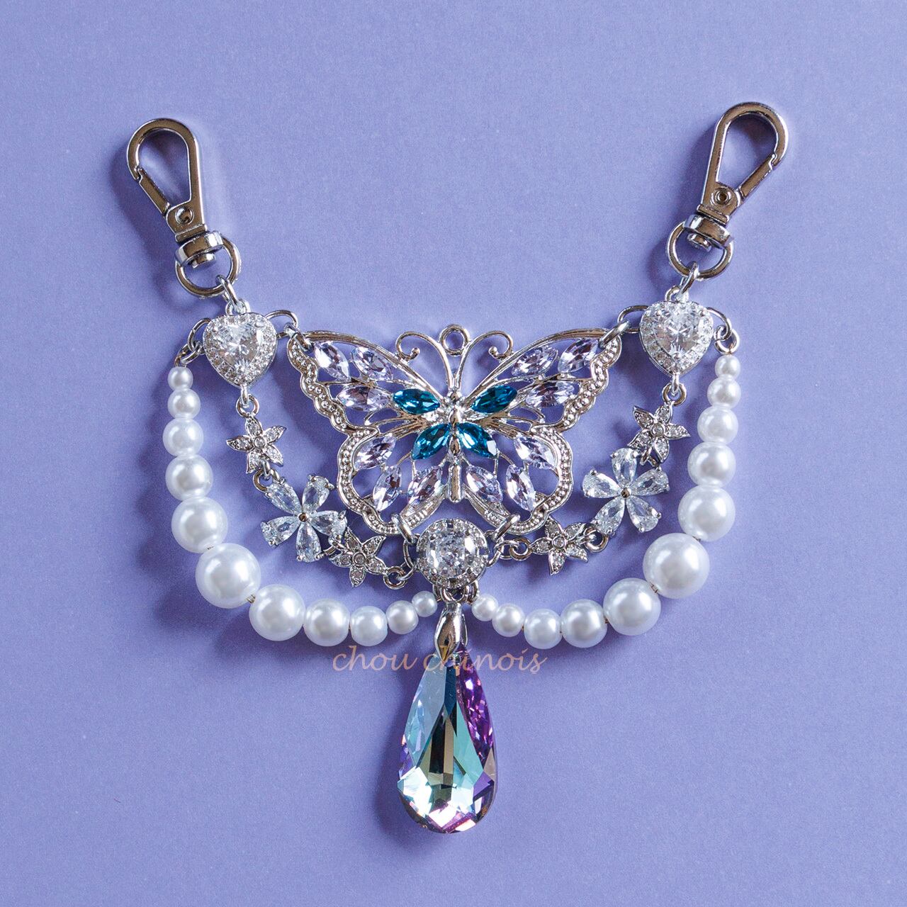 大きく翅を広げた蝶に花々やパール調ビーズ、幻想的な輝きを放つクリスタルガラスを添えて小さなつけ襟のようなスタイルに仕上げました。