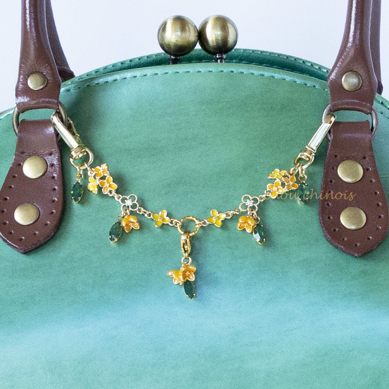 今回は両端にキーフックの付いた、バッグの持ち手付け根にネックレスのように飾って頂けるタイプを制作しました。