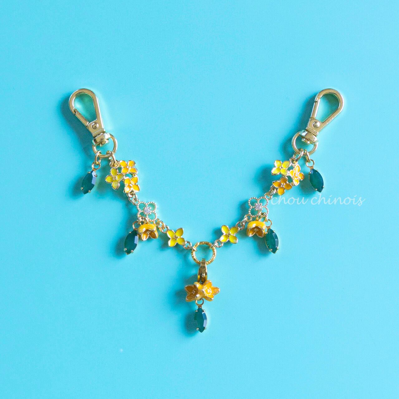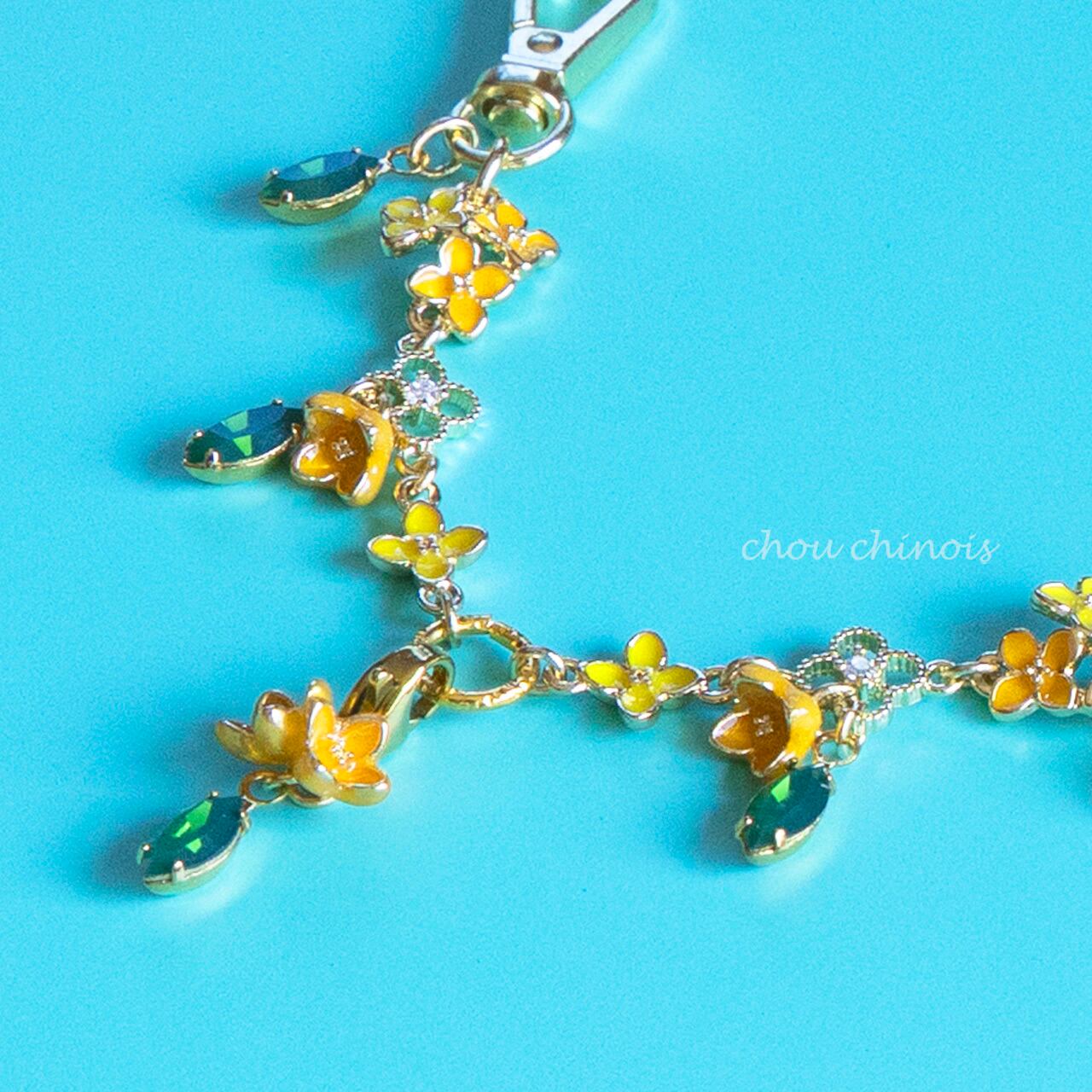 愛らしいイエローとオレンジのお花に、優しいグリーンの葉っぱを添えて、秋のお出かけにぴったりのチェーンに仕立てました。