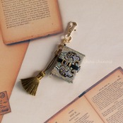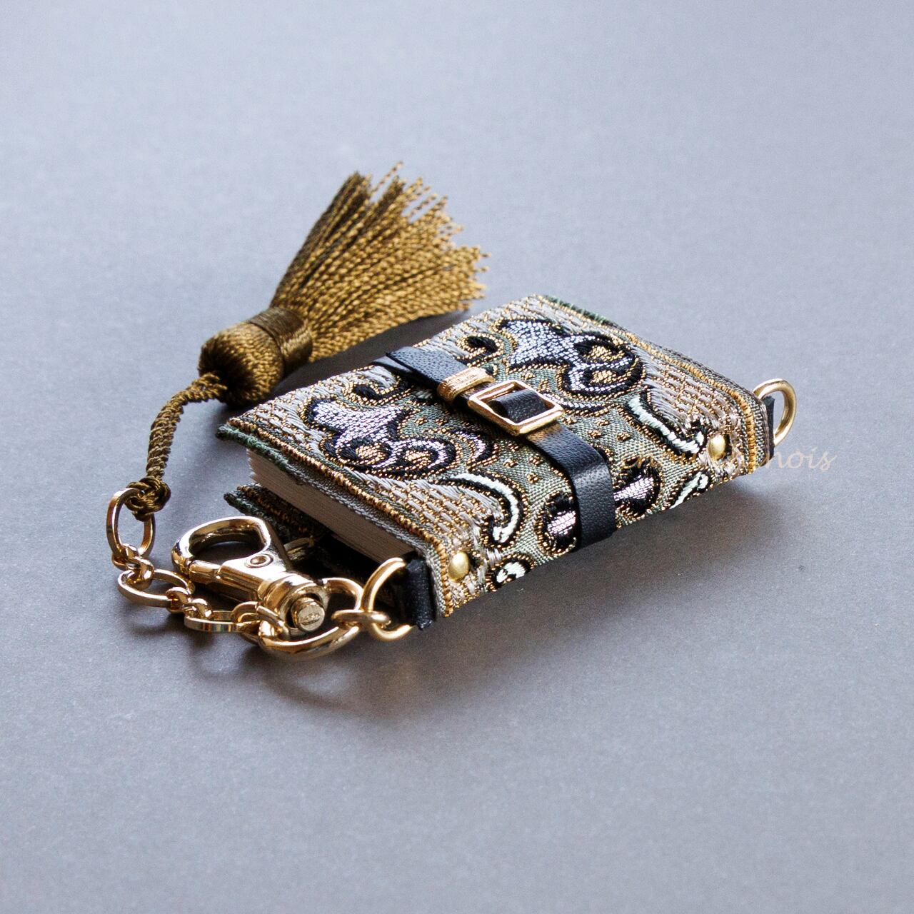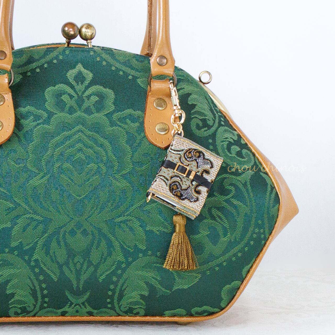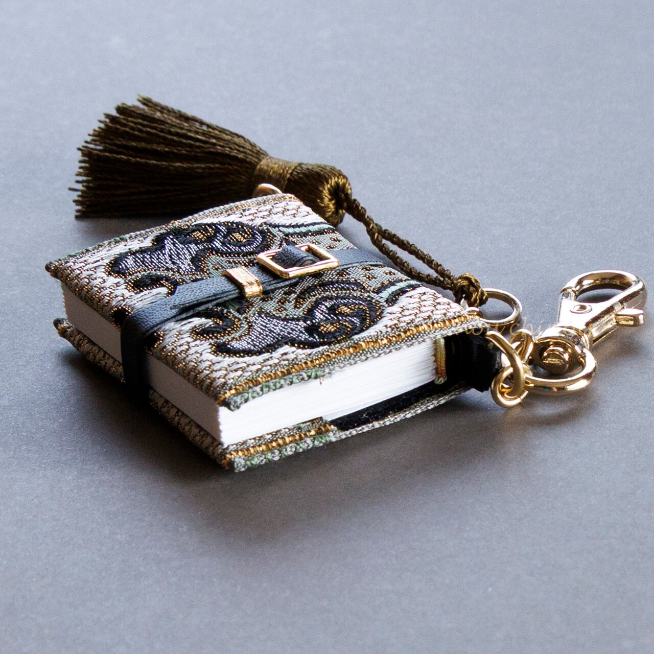 フランス製の幅広リボンを表紙に見立てて制作した、小さな本型チャームです。