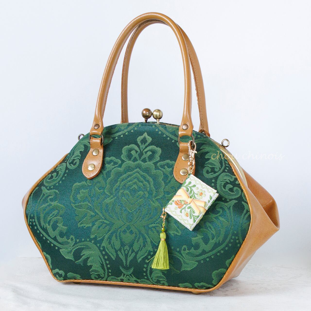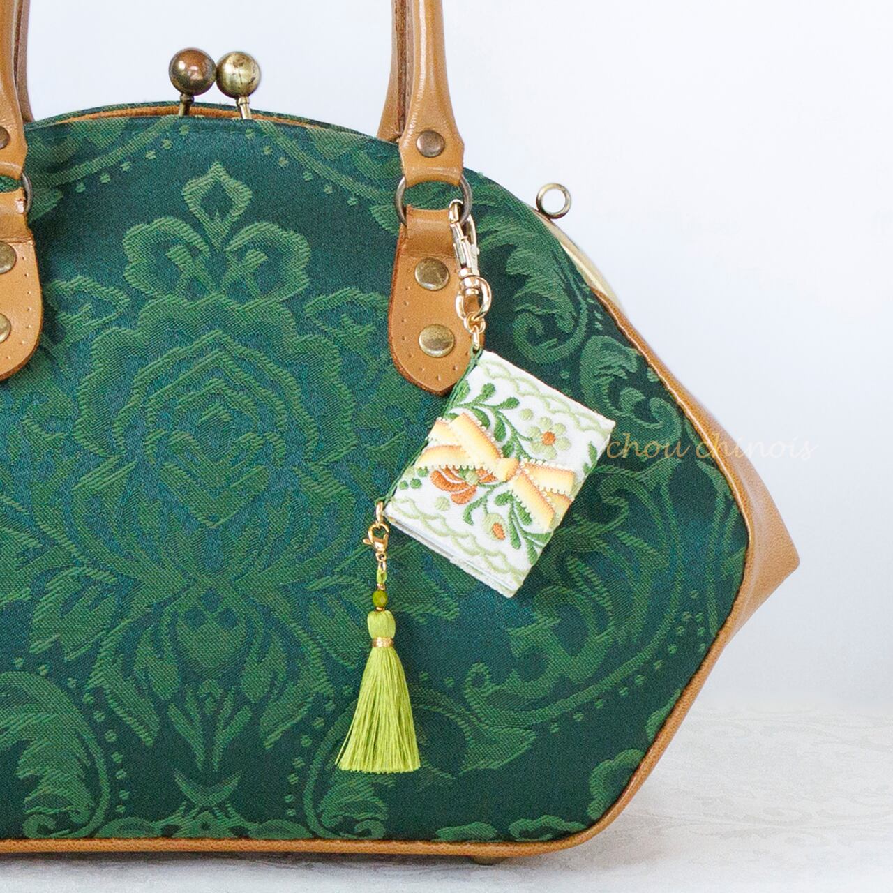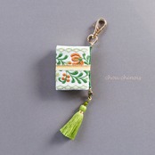 フランス製の幅広リボンを表紙に見立てて制作した、小さな本型チャームです。