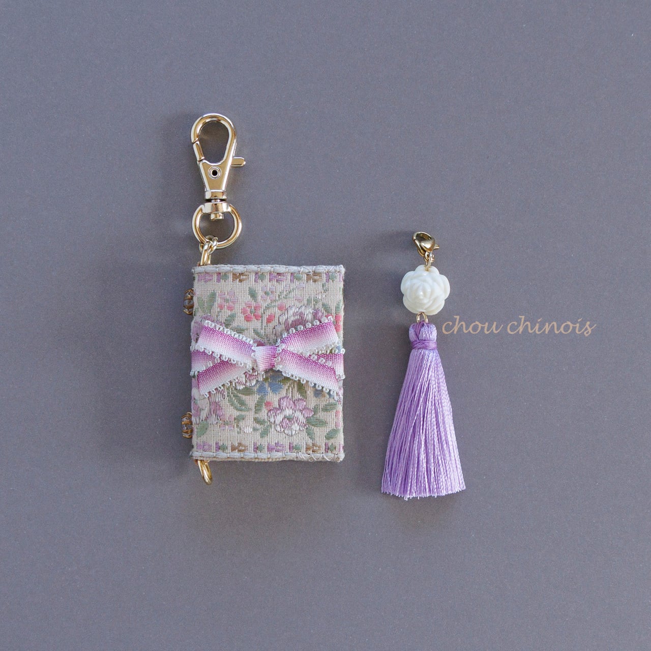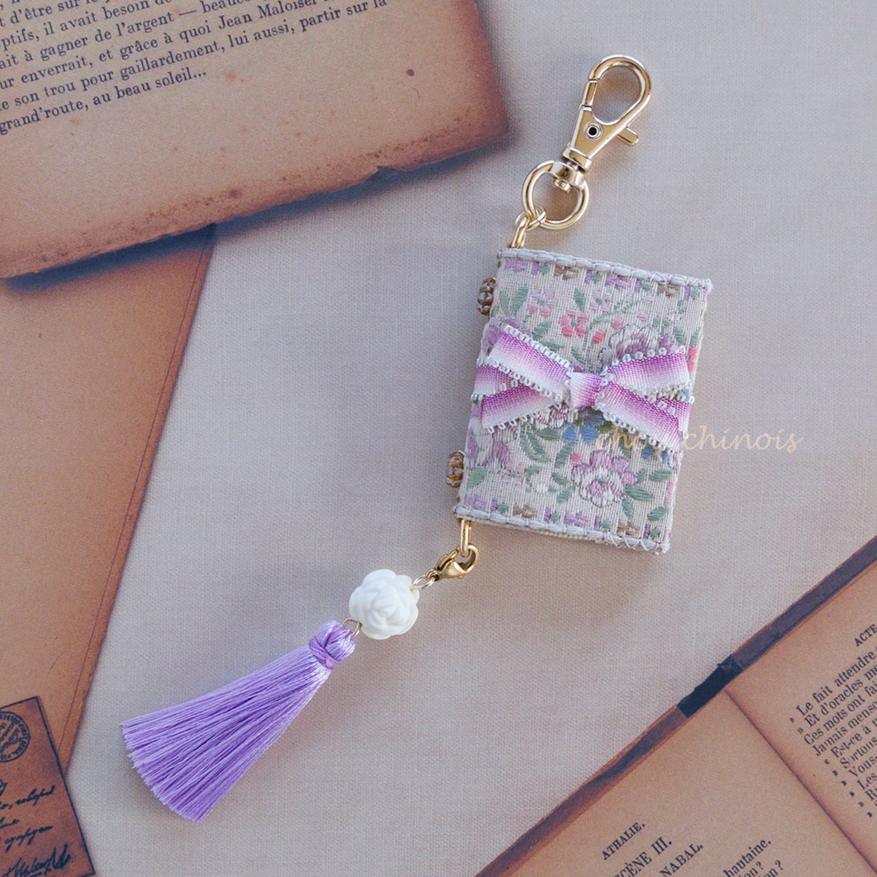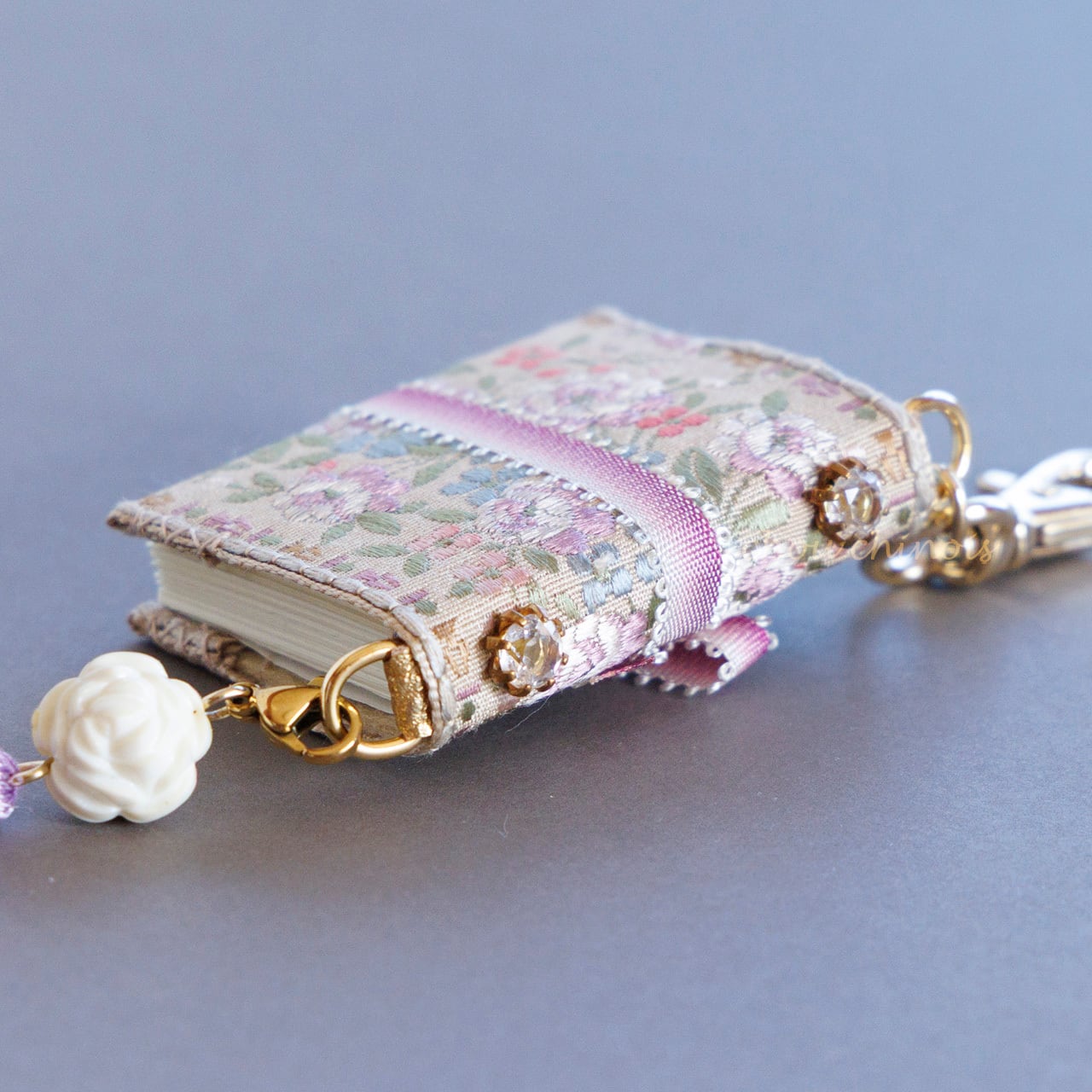 チャーム本体の背表紙下部には小さなDカンがついています。お届け時は薔薇のヴィンテージビーズを添えたカニカン付きタッセルを着けていますが、お手持ちのチャームと交換してオリジナルアレンジもお楽しみ頂けます。