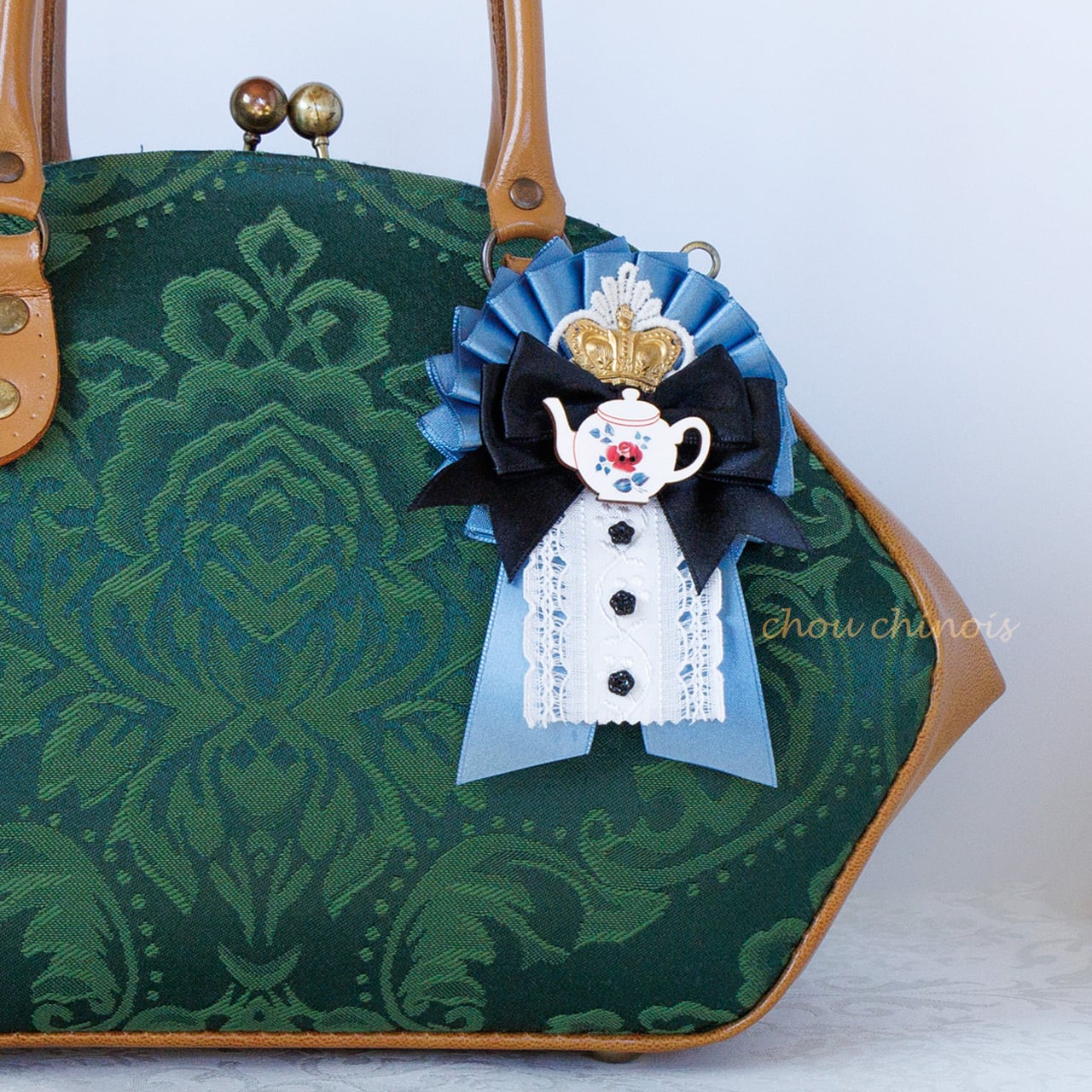 最後の1点ということで、えいやー!とデザインも一新し、黒いおリボンをどどん!と中央に配置しました。黒い大きなおリボンに重ねる事でティーポットがくっきりと映えています。