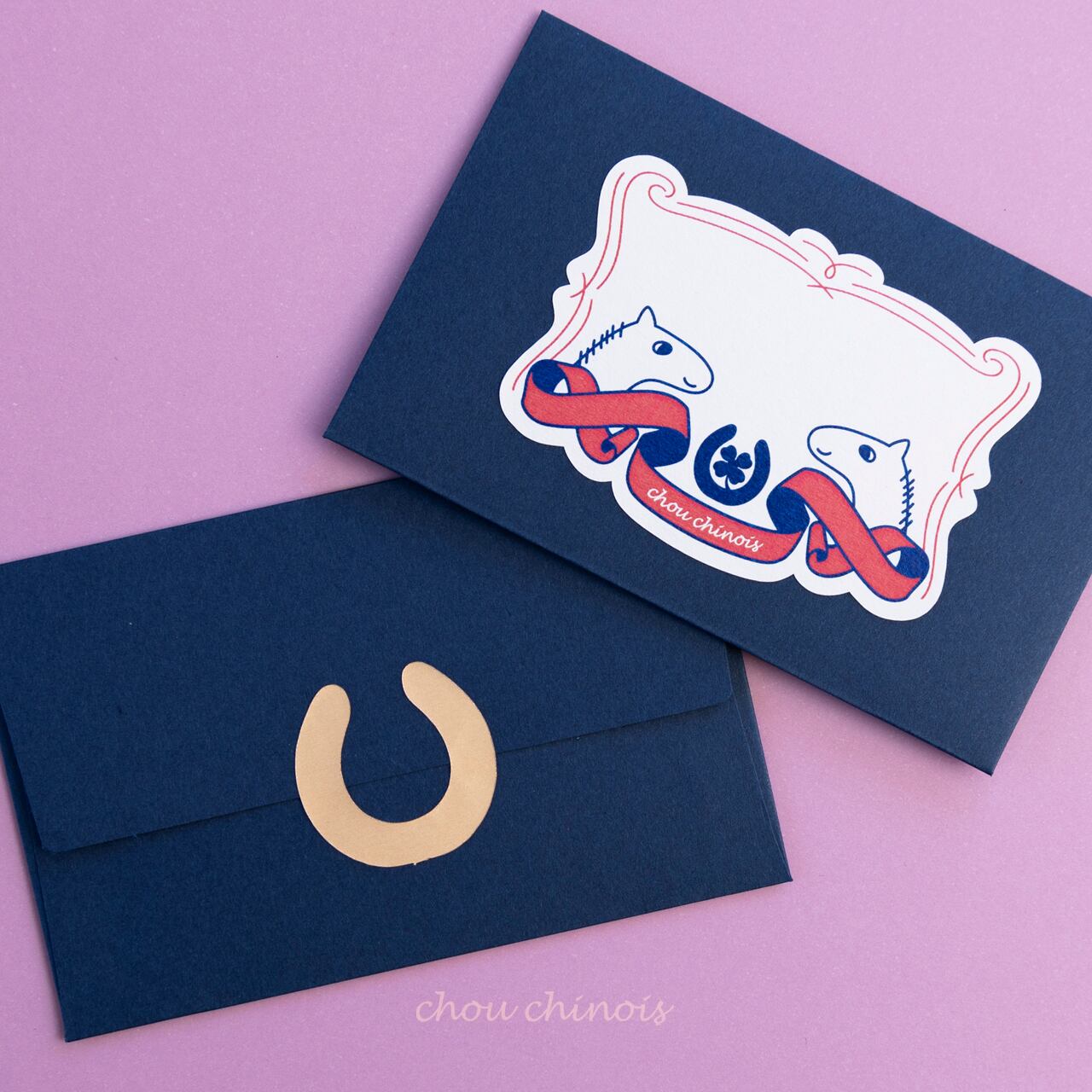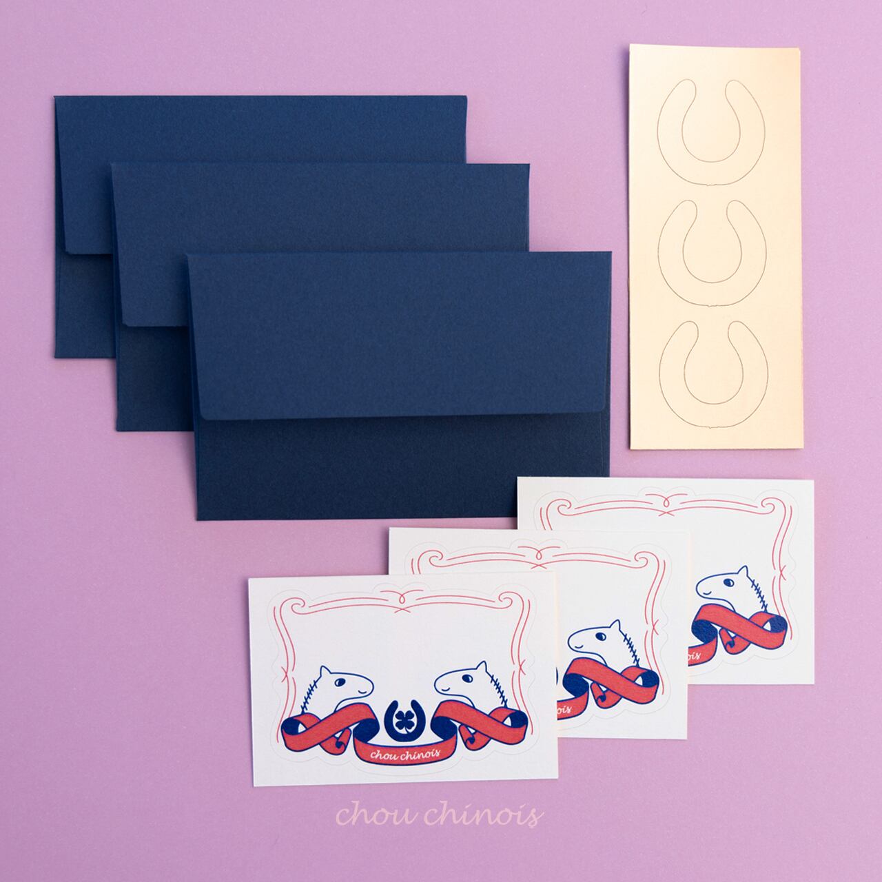 封緘の馬蹄シールはオリジナルで制作しました。馬蹄は幸運のモチーフ。祈りを込めてえいや!と幸せを閉じ込めてください。
