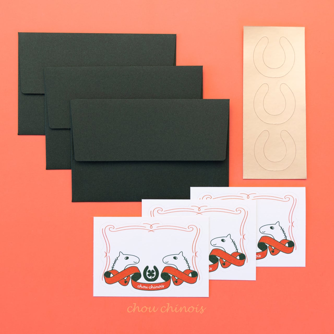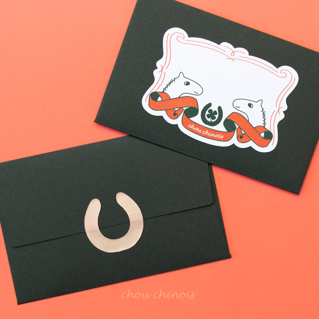 封緘の馬蹄シールはオリジナルで制作しました。馬蹄は幸運のモチーフ。祈りを込めてえいや!と幸せを閉じ込めてください。