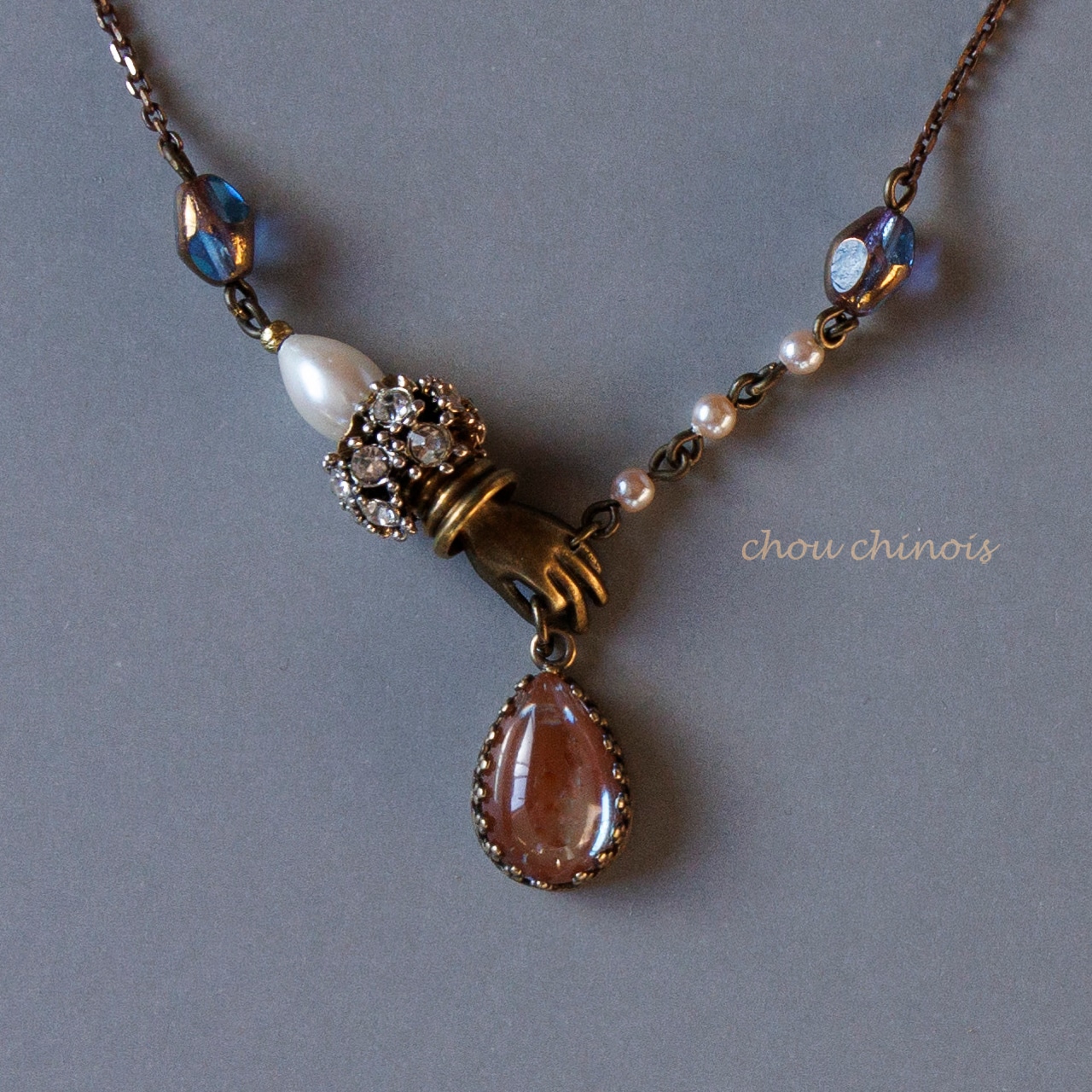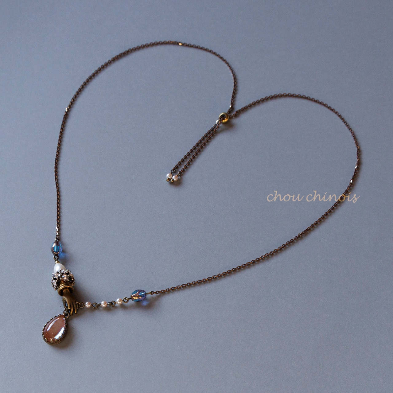サフィリーンのカラーに合わせて、金具はアンティークゴールド系でまとめ、ブラウンにペイントされたチェーンを採用しています。