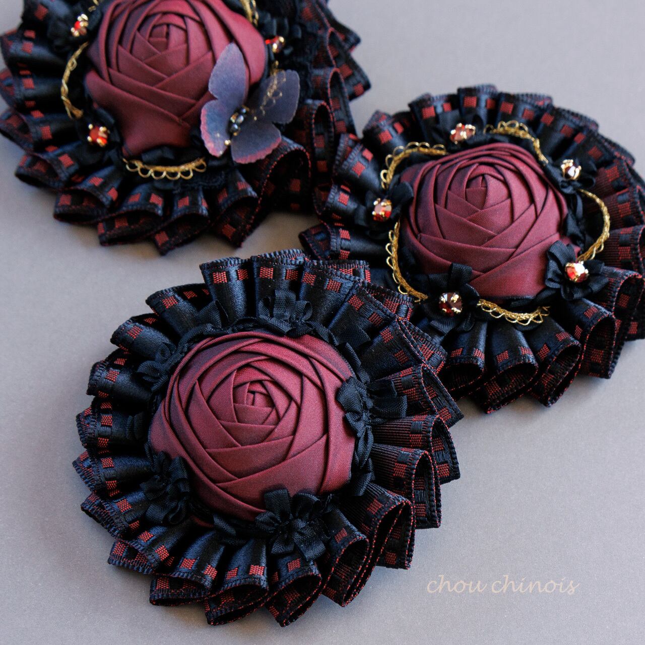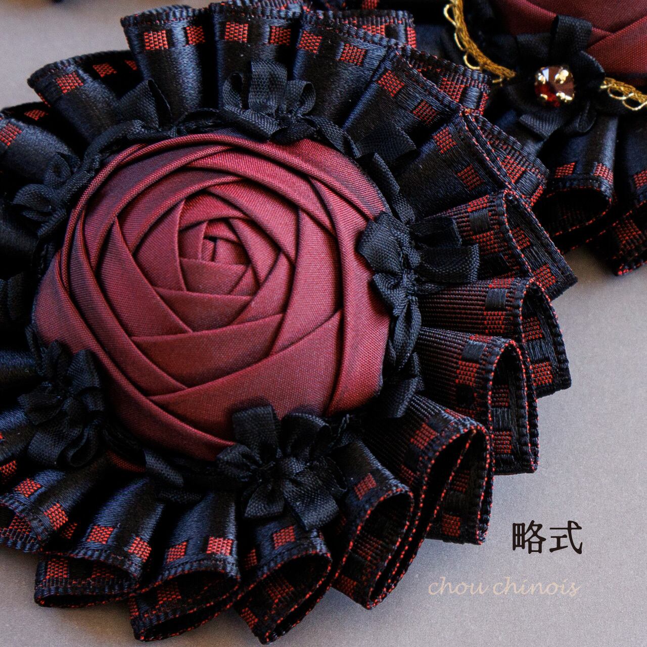 赤と黒と金と薔薇を象徴にしている暗黒騎士団の新たな装身具です。パリッと薄手の黒x赤のリボンでドロップローズを咲かせました。「略式」を基本に「正式」「華麗」と3段階から仕上がりをご選択頂けます。
