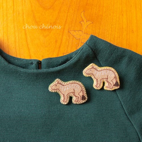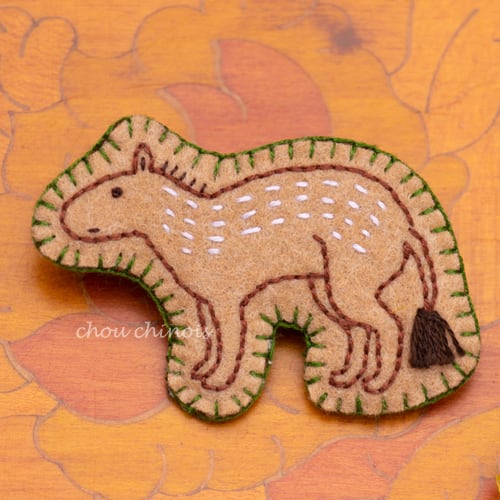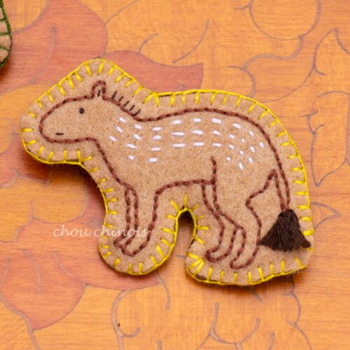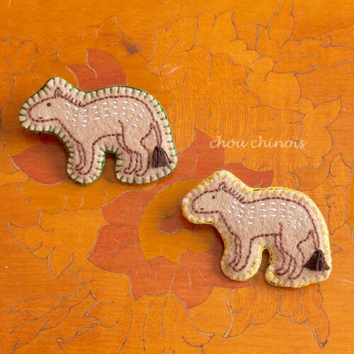ざっと5000万年前に生きていた、馬の祖先と言われているエオヒップス(ヒラコテリウム 日本名;あけぼのうま)を可愛くデフォルメして手刺繍しました。つぶらな瞳と、小さなお口、ふさふさしっぽがチャームポイントです。エオヒップスの時代は現在の馬のように草原では無く、森を住処とし、体も現在の馬と比べ、とても小柄だったようです。