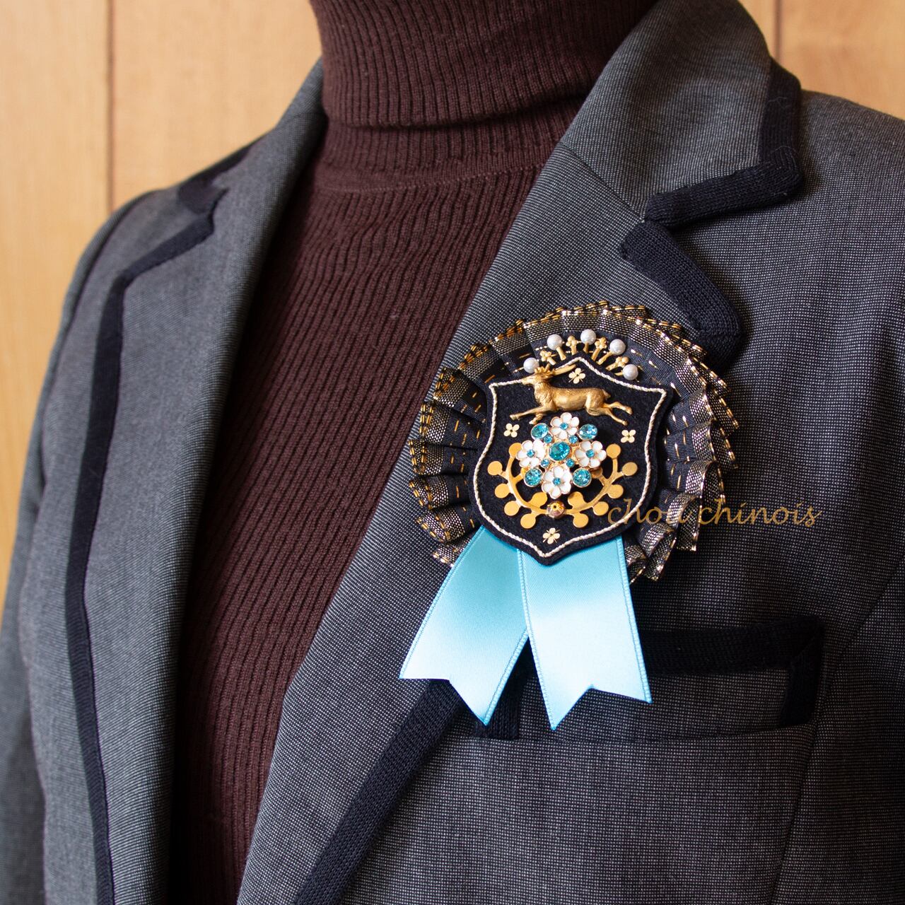 ロゼットの背面にブローチピンをお付けすることも可能です(0円)。ご希望の方はオプションの「ブローチピンの有無」より「あり」を選択ください。